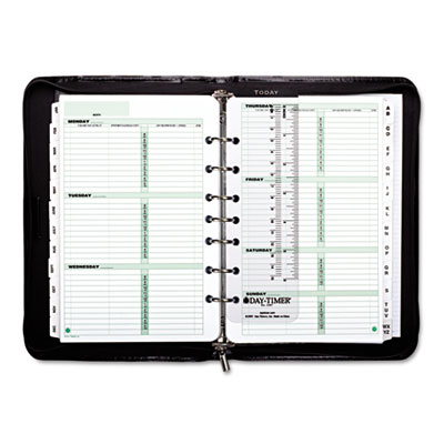 High-quality bonded leather that provides a polished, professional look. Includes a sturdy binder with undated calendar pages, tabbed address/phone directory, tabbed monthly dividers, 24-sheet lined notepad, business/credit card holder, vinyl zip pouch, handy reference pages and a page locator. Size: 5 1/2 x 8 1/2; Page Color/Theme: White.