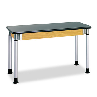 Height can be adjusted without tools, by one person, in less than 30 seconds! Versatile tables let you adjust only one end for an inclined physics table; lower to 27" high for use in elementary grades; raise to 39" high for display work. Solid oak 4-1/2" high frame with exposed metal corner braces complements the powder coated legs. 500-lb. capacity. Adjustable leveling glides. Tables adjust from 27" to 39" high. Top Color: Black; Base Color: Oak; Top Shape: Rectangular.