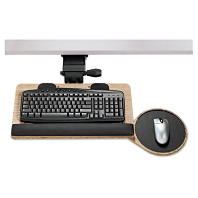 Constructed of durable, long-lasting bamboo harvested from managed forests makes it as earth-friendly as it is ergonomic. Thin, low-profile design. Lift-and-set spring mechanism lets you adjust height by lifting the keyboard. Removable palm rest. Workstation Type—Curved, diagonal or straight. Color: Black; Workstation Type: Curved; Diagonal; Straight.