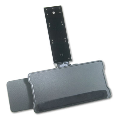 Tilts +/-15° and swivels 360°. Pullout mouse tray. Nonskid vinyl coating and removable palm rest. Extends 2" from worksurface. Workstation Type—Straight Glide Track Length—17" Keyboard Tray Dimensions—22-3/4 wide x 10-1/2 long. Color: Black; Workstation Type: Straight.