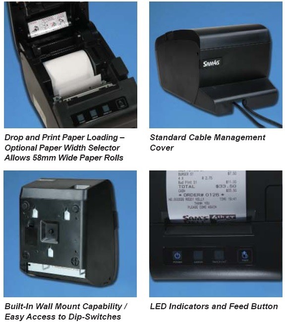 The Ellix 30 leads the next generation of POS printers from SAM4s. Compact yet solid, it incorporates user friendly features such as anti-jam technology, a water-resistant surface and drop-in paper loading.