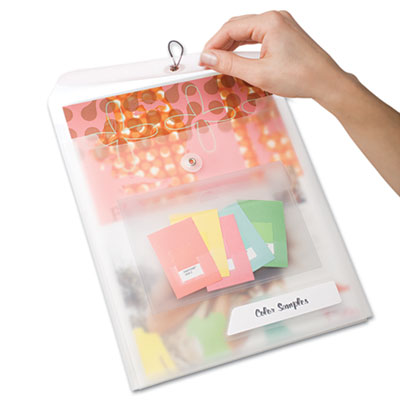 Clear material for easy identification of contents. Fold-out channel strip slides page in securely and tucks away when not in use. Exterior polypropylene pocket holds all types of documents and materials, such as swatches, paint chips, receipts and invoices. Envelope Size: 8 1/2 x 11; Envelope/Mailer Type: Expansion Pocket; Closure: Elastic.