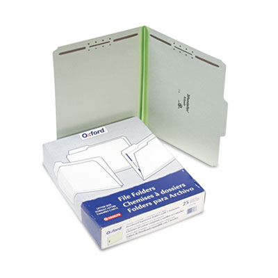 Extra heavy-duty 25 pt. pressboard provides outstanding durability, safeguards paperwork—ideal for frequently accessed files. 2" capacity prong fasteners embossed into front and back covers holds papers firmly in place. Tyvek® rip-proof tape reinforced gussets. Classification Folder Type: Top Tab; Size: Letter.