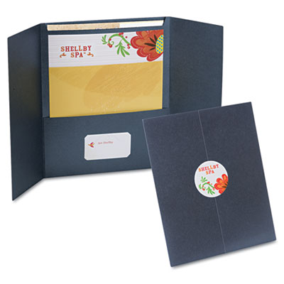 Quickly and easily create a personalized presentation right at your desk. French door style cover that opens to reveal two stacked pockets. Create custom closures with the 12 printable stickers enclosed. Choose from circle, square, diamond shapes. Premium grade paper provides strength and durability. Die cut business card holder on front interior pocket. Front Cover Color(s): Black; Back Cover Color(s): Black; Sheet Size: 11 x 8 1/2.