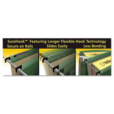 Features SureHook® technology with revolutionary built in tension springs. Rods and hooks are stronger and sturdier with less bending. Folders stay on rails and slide with ease. Preprinted indexed A-Z tabs in assorted positions. Rip-proof tape reinforced gusset tops. Includes 10 self-adhesive blank labels. Hanging File Folder Type: Classification; Size: Letter; Expansion: 3 1/2".
