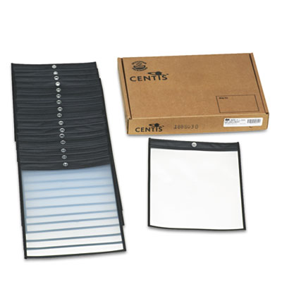 Hand-sewn black leatherette top panel resists tearing for optimum durability. Nonstick, acid-free holders provide instant visibility for job tickets, charts, schedules, lists and instructions. Stitched edges for added strength. Convenient metal eyelet for hanging. Closed on three sides for maximum protection. Load Orientation: Top; Sheet Protector Type: Shop Ticket.