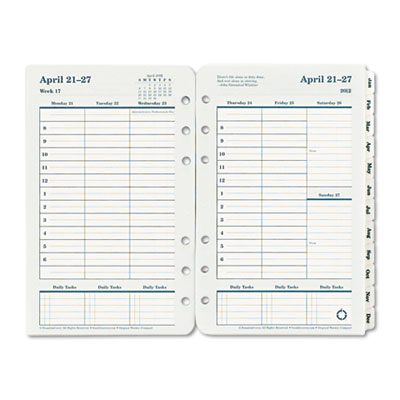 Two-in-one planning, plus future planning calendar. Index tabs for quick access to monthly sections. Size: 4 1/4 x 6 3/4; Appointment Ruling: 8 AM to 8 PM Mon.-Fri..