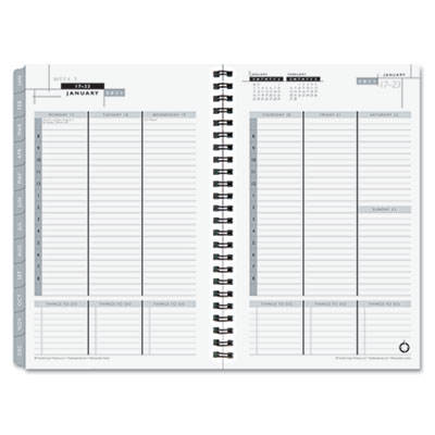 Professional looking and practical with sleek styling and vertical schedule columns. View each week's schedule at a glance with the two pages per week format. Features a things-to-do section for each day of the week, phone/address pages and two page monthly calendar tabs. Size: 5 1/2 x 8 1/2; Appointment Ruling: 8 AM to 8 PM.