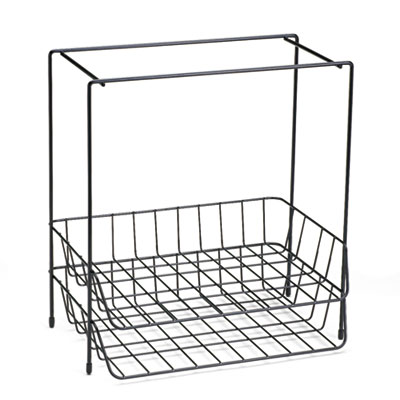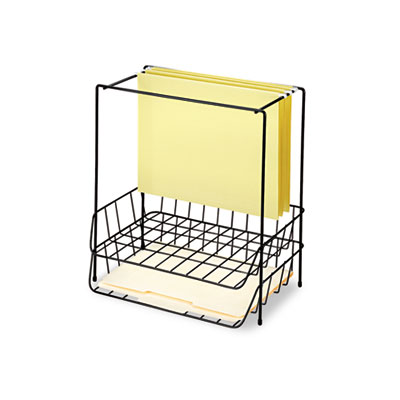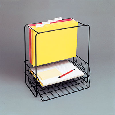 Keep your desk organized and folders, files and important loose papers all together. Wire hanging file is combined with two side load letter trays (folders sold separately). Holds up to 6 1/2" of letter size hanging file folders. Rubber feet protect desktop. Hanging File Folder Rack Type: Wire; For File Size: Letter; Capacity (text): 6 1/2".
