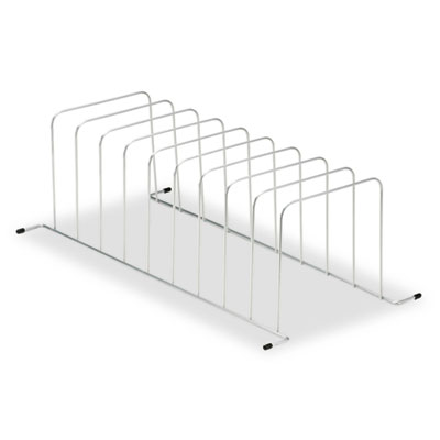 Extra-long organizer provides ample space to keep active files in clear view. Generous spacing between dividers. Also fits in a file drawer. Wire design will not collect dust. Rubber-tipped feet. Desktop File Folder Sorter Type: Vertical File Sorter; Number of Compartments: 9; Material(s): Wire.