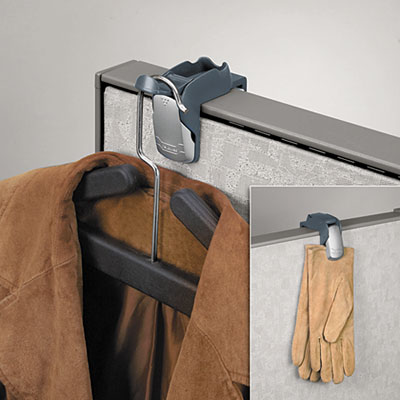 Premium aluminum hook holds coat or umbrella. Clip securely grips hat or gloves. May be used to hold an easel pad or note pad. Fits standard 1 1/2" to 3 1/4" cubicle wall widths. Holds 15 lbs. Panel Accessory Type: Clip;Coat Hook; Width: 1 5/8"; Depth: 2 3/4".