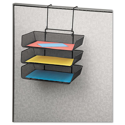 Contemporary mesh/wire panel-mount design brings office organization to a new level. Three 2" capacity, side load letter size trays. Universal mounting bracket fits panels 1 1/2" to 3" thick. Wall-mountable fasteners included. Partition mount 17 7/8" high, wall mount 11 7/8" high. Panel Accessory Type: Organizer; Width: 13 3/8"; Depth: 14".
