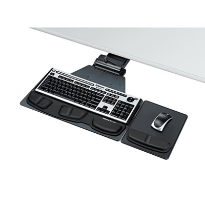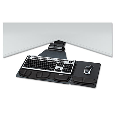 Ergonomic, swiveling and sliding keyboard tray has gel-filled wrist support. It also has an articulating arm and a swiveling mouse tray. Designed to fit corner, diagonal, curved and straight workstations. Color: Black; Workstation Type: 90° Corner; Curved; Diagonal; Straight.