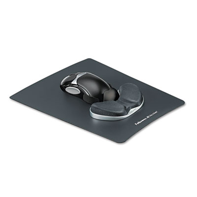 Compact, easy-gliding design encourages healthy, natural movement. Patented Health-V™ Channel reduces wrist pressure to help prevent carpal tunnel syndrome. Microban® antimicrobial protection helps keep glide and mouse pad surface clean. Optical mouse-friendly mouse pad ensures optimal performance. Compact glide works on or off mouse pad. Fabric cover. Wrist Filling Material: Memory Foam; Mouse Pad/Wrist Rest Type: Memory Foam Gliding Palm Support with Mouse Pad; Color(s): Graphite.
