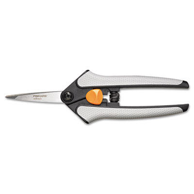 The cushioned, textured grip makes cutting easy and comfortable. Ideal for large cutting jobs. Equipped with an easy-action spring with slide lock and precision-ground blades. Cut Length: 1 3/4"; Scissor Length: 5"; Tip Type: Micro Tip.
