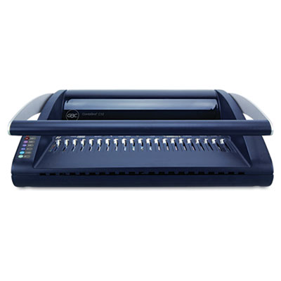 Compact light-weight design fits easily on any desk. Low profile comb fingers make loading combs easier. Horizontal punch loading for easy loading of papers. Adjustable edge guide aligns sheets accurately. Spine size guide aids in determining the correct spine for the document size. Ergonomic handle. Includes quick step user guide located right on the machine for simple and intuitive operation. Binding Spine Type: Comb; Binding Sheet Capacity: 225; Punching Sheet Capacity: 12.