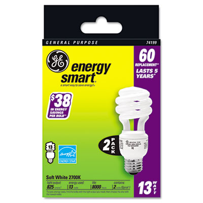 Conserve energy with this Energy SmartŪ light bulb. Emits soft white light. Efficient (saves up to 75% of electric costs over incandescent bulbs, considered the "GREEN Movement's" bulb of choice). Spiral Light Bulb. Brightness: 825 lm; Voltage: 120 V; Power: 13 W.