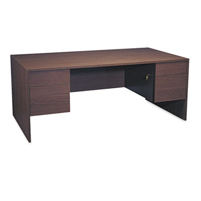 Attractive, understated style that blends easily with existing office furnishings. Thermally fused laminate provides strength and durability. Locking drawers operate on fully progressive ball bearing suspension. File drawers extend fully and hold letter or legal size files; box drawers extend three-quarters. Recessed three-quarter height modesty panel for privacy. Leveling glides help compensate for uneven floors. Color: Mahogany; Pedestal Count: 2; Top Shape: Rectangular.