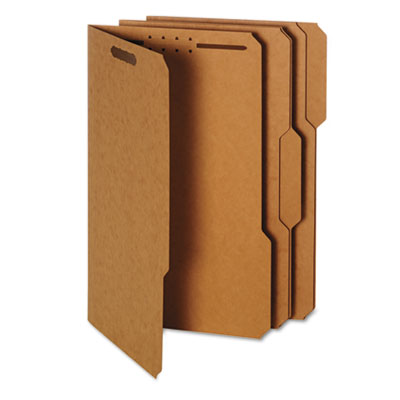Secure and subdivide related documents within one file with the 2" capacity embedded fasteners. Heavy-duty covers stand up to active use. Tabs in assorted positions. Scored for 3/4" expansion to manage growing files. File Folder Type: Top Tab; Size: Legal; Folder Material: 17 pt. Kraft Stock.