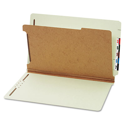 Multiple sections simplify project management. Durable 25 pt. pressboard covers feature 2" capacity embedded fasteners. Inner Kraft dividers with dual 1" capacity fasteners help sort files and organize paperwork. Tear-resistant TyvekŪ gussets stand up to frequent use. Classification Folder Type: End Tab; Size: Legal; Number of Sections: 4.