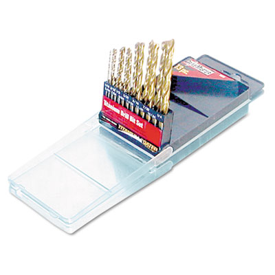 Titanium coated for quick penetration. Lasts up to six times longer. 135° split point reduces walking. Handy plastic storage case with stand-up rack for easy selection of bit sizes. Coating: Titanium.