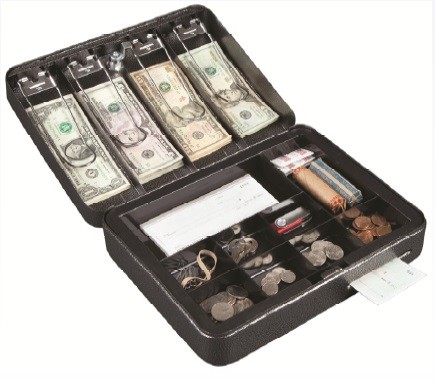 Custom Cash Box with 8 coin and 1 bill tray on bo??om and 4 spring loaded bill clips on top lid features convenient slot under tray for quick deposit. Convenient carry handle.