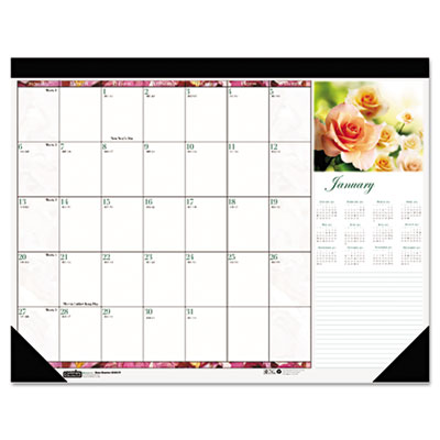 Different full color rose photo each month. Unruled daily blocks. Simulated leather binding and corners. Full year calendar reference blocks. Size: 18 1/2 x 13; Page Color/Theme: Floral.