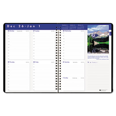 Enjoy nature scenes while scheduling your workweek appointments. Space for notes. Made of 100% post-consumer recycled paper. Executive hard cover. Size: 8 1/2 x 11; Page Color/Theme: Earthscapes; Appointment Ruling: 8 AM to 5 PM Mon.-Fri..