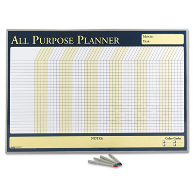 Versatile all-purpose undated planner offers endless possibilities for customization. Columns and rows are ideal for project and personnel planning. Space at bottom for additional scheduling and notes. Laminated surface wipes clean with a damp cloth. Long-lasting hardboard backer and an attractive aluminum frame. Includes a set of four water soluble markers in black, red, blue and green plus built in hangers for simple mounting to the wall. Board Type: Planner; Board Width: 32"; Board Height: 21 1/2".