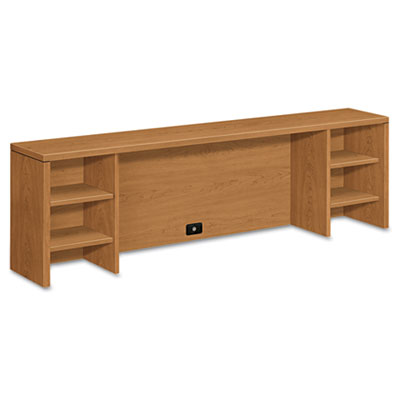 Create a computer work area with this practical organizing hutch. Durable woodgrain laminate is scratch-, stain- and spill-resistant for years of trouble-free performance. Four adjustable open shelves keep supplies organized while 20 3/4" high center section accommodates your computer equipment. Clean, straight edges provides a streamlined look. Convenient cord management grommet. Color: Harvest; Overall Width: 72"; Overall Depth: 14 5/8".