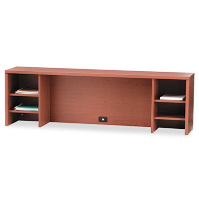 Create a computer work area with this practical organizing hutch. Durable woodgrain laminate is scratch-, stain- and spill-resistant for years of trouble-free performance. Four adjustable open shelves keep supplies organized while 20 3/4" high center section accommodates your computer equipment. Clean, straight edges provides a streamlined look. Convenient cord management grommet. Color: Henna Cherry; Overall Width: 72"; Overall Depth: 14 5/8".