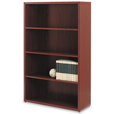 Dependable and durable laminate with style is perfect for the practical professional. No assembly required for quick and easy installation. Straight edges provide a streamlined look. Color: Mahogany; Material: Woodgrain Laminate; Shelf Count: 4.