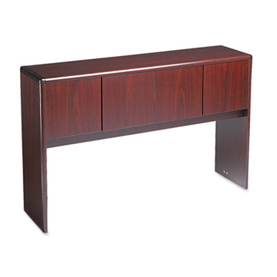 A modular management solution that combines stylish profiles and elegant accents with top-grade fit and finish. Abrasion- and stain-resistant laminate with elegant hardwood trim. Four doors conceal two storage compartments. Self-closing, adjustable hinges plus valance to hide optional task lighting. Color: Mahogany; Overall Width: 56 5/8"; Overall Depth: 14 5/8".