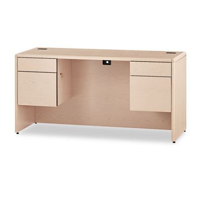 A modular management solution that combines stylish profiles and elegant accents with top-grade fit and finish. Laminate with rounded corners and waterfall edge. Full-extension file drawers and 3/4-extension box drawers ride on steel ball bearing suspensions. Hang rails accommodate letter and legal size hanging files. Two cord management grommets. HON® “One Key” core removable locks. Color: Natural Maple; Pedestal Count: 2; Drawer Configuration: Left: Box/File; Right: Box/File.