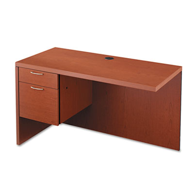 Thick 1 1/2" tops make a decidedly upscale impression. Abrasion- and stain-resistant laminate over 1 1/2" thick solid core high-density particleboard. Drawers operate on ball bearing suspensions; file drawers extend fully and accommodate letter or legal size hanging files, box drawers extend three-quarters. Cord management grommet. Desk and Return sold and shipped separately—ORDER BOTH. Use with Single Pedestal Desk to form an "L" workstation. Brushed brass sweep pull. Color: Henna Cherry; Pedestal Count: 1; Drawer Configuration: Left: Box/File.