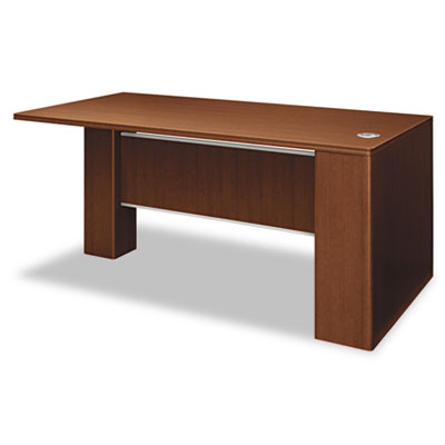 Contemporary designs with enhanced storage solutions and smart technology. Durable, easy-care laminate with vertically-matched woodgrain is abrasion- and stain-resistant. Floating frosted modesty panel with silver frame. Includes under-work surface storage area. Cord grommet in top. Floating laminate modesty panel with platinum accents. Color: Shaker Cherry; Overall Width: 72".