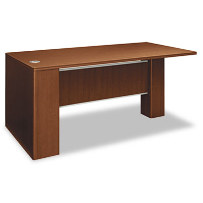Contemporary designs with enhanced storage solutions and smart technology. Durable, easy-care laminate with vertically-matched woodgrain is abrasion- and stain-resistant. Open floating modesty panel permits easy access to power/data wall outlets. End panel side has general storage area. 7" support column for stability. Wire grommet for cord management. Floating laminate modesty panel with platinum accents. Color: Shaker Cherry; Overall Width: 72".