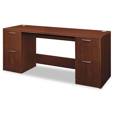 Contemporary designs with enhanced storage solutions and smart technology. Easy-care laminate with vertically-matched woodgrain is abrasion- and stain-resistant. Drawers extend fully and operate on high-quality steel ball bearing suspensions. Open modesty panel allows access to outlets. Two cord grommets to route wires and cables. Color: Shaker Cherry; Pedestal Count: 2; Drawer Configuration: Left: File/File; Right: File/File.