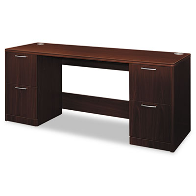 Contemporary designs with enhanced storage solutions and smart technology. Easy-care laminate with vertically-matched woodgrain is abrasion- and stain-resistant. Drawers extend fully and operate on high-quality steel ball bearing suspensions. Open modesty panel allows access to outlets. Two cord grommets to route wires and cables. Color: Mahogany; Pedestal Count: 2; Drawer Configuration: Left: File/File; Right: File/File.