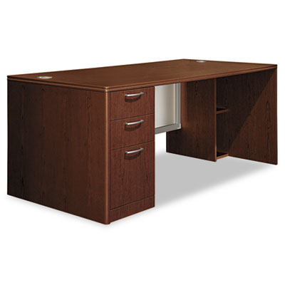 Contemporary designs with enhanced storage solutions and smart technology. Easy-care laminate with vertically-matched woodgrain is abrasion- and stain-resistant. Drawers operate on high-quality steel ball bearing suspensions; file drawer extends fully, box drawers extend three-quarters. Integrated wire management--grommets ensure a clutter-free work space. Laminate modesty panel is attached 2" below desk so open modesty panel permitting easy access to power/data wall outlets. Color: Shaker Cherry; Pedestal Count: 1; Top Shape: Rectangular.