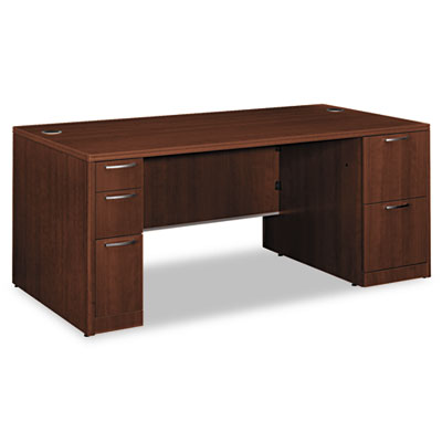 Contemporary designs with enhanced storage solutions and smart technology. Easy-care laminate with vertically-matched woodgrain is abrasion- and stain-resistant. Telescoping slim profile left pedestal has full-extension pencil/media/file drawers with progressive ball bearing slides. Full right pedestal has full-extension file/file drawers with high-quality ball bearing suspension. Integrated wire management--grommets ensure a clutter-free work space. Open modesty panel permits easy access to power/data wall outlets. Color: Shaker Cherry; Pedestal Count: 2; Top Shape: Rectangular.