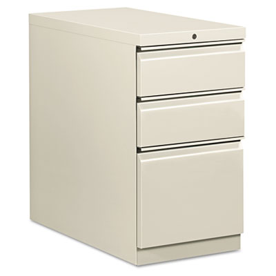 Steel ball bearing suspension; full extension on file drawer, 90% extension on box drawers. High-sided file drawer allows front-to-back letter size filing and includes follower block and crossrail. Counterweight inhibits tipping when opening more than one drawer. Fits under 29-1/2" high workstations. Fixed front casters and swivel back casters for easy mobility. "One Key" core removable lock makes re-keying quick and easy. Color: Light Gray; Overall Width: 15"; Overall Depth: 28 7/8".