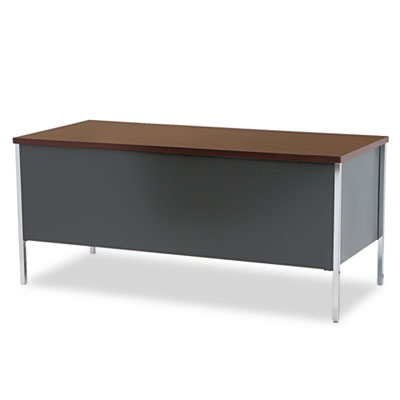 Attractively finished, easy-care laminate top and polished chrome legs provide an upscale look. Full-extension, high-sided, triple-tied suspension drawer accommodates hanging files. Nylon roller suspension system-equipped, three-quarter extension box drawer opens and closes smoothly. Center drawer houses an included supply tray and features a convenient universal drawer lock. HONŽ interchangeable lock cores simplify key management. Three-quarter modesty panel delivers privacy. Use freestanding or combine with Return to create an "L" Workstation. Color: Mahogany; Charcoal; Pedestal Count: 1; Top Shape: Rectangular.