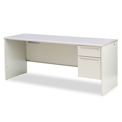 Steel frame with steel-reinforced, high-pressure laminate top for superior rigidity and strength. Drawers operate on heavy-duty steel ball bearing suspensions. High-sided, full-extension file drawer accepts hanging file folders; box drawer extends three-quarters. HON® “One Key” core removable locks. Cord management with ports and hidden channels. Color: Gray; Pedestal Count: 1; Drawer Configuration: Box/File.
