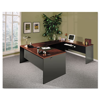 High-pressure laminate top is moisture-, scratch- and stain-resistant. Two worksurface grommets help control cord and wires. Three-quarter height modesty panel for privacy. Combine with Bridge, Return, Credenza Shell or Peninsula to create a "U" or "L" workstation. Non-handed shell can be arranged for either left- or right-handed configurations. 6" conference overhang provides additional writing space for meetings. Color: Mahogany; Charcoal; Top Shape: Rectangular.