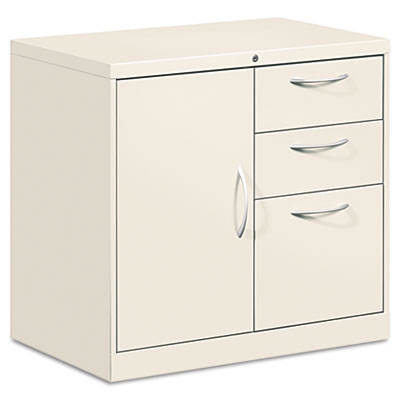Enclosed bookcase includes one shelf that adjusts in 2" increments; holds one row of binders above or below. Box/box/file drawers operate on heavy-duty steel ball bearing suspension. Box drawers includes divider; file drawer contains follower block and crossrail and accommodates letter and legal size files. Satin chrome arch pulls. HONŽ "One Key" interchangeable core removable lock. Leveling glides adjust for uneven floors. Box/Box/File Right and Bookcase with Door Left. Color: Light Gray; Overall Width: 30"; Overall Depth: 18".