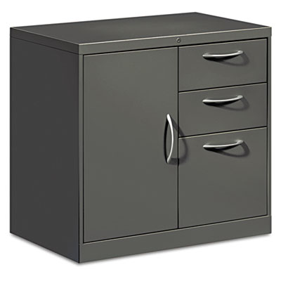 Enclosed bookcase includes one shelf that adjusts in 2" increments; holds one row of binders above or below. Box/box/file drawers operate on heavy-duty steel ball bearing suspension. Box drawers includes divider; file drawer contains follower block and crossrail and accommodates letter and legal size files. Satin chrome arch pulls. HONŽ "One Key" interchangeable core removable lock. Leveling glides adjust for uneven floors. Box/Box/File Right and Bookcase with Door Left. Color: Charcoal; Overall Width: 30"; Overall Depth: 18".