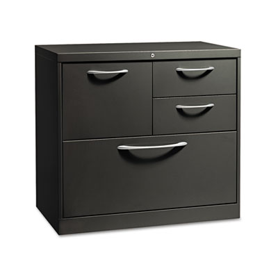 Drawers operate on heavy-duty steel ball bearing suspension. Box drawers include divider; file drawer contains follower block and crossrail. Accommodates letter and legal size hanging file folders. Satin chrome arch pulls. HONŽ "One Key" interchangeable core removable lock. Leveling glides adjust for uneven floors. File/Box/Box/Lateral. Color: Charcoal; Overall Width: 30"; Overall Depth: 18".