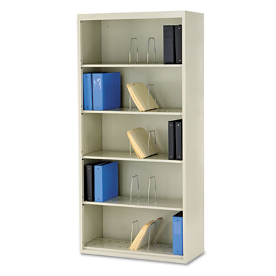 Jumbo open shelf file. Great for critical files with frequent retrieval. Five fixed shelves. 13 3/4" height between shelves make it easy to store three-ring binders. Color: Putty; Overall Width: 36"; Overall Depth: 16 3/4".