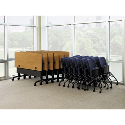 Lightweight yet durable aluminum construction. Tables nest easily for space-efficient storage. Advanced hinge mechanism allows the tabletop to fold down safely and softly. Modesty panels drop down and out of the way when tables are nested. Four casters (two locking) for quick and easy mobility. Base Color: Charcoal.